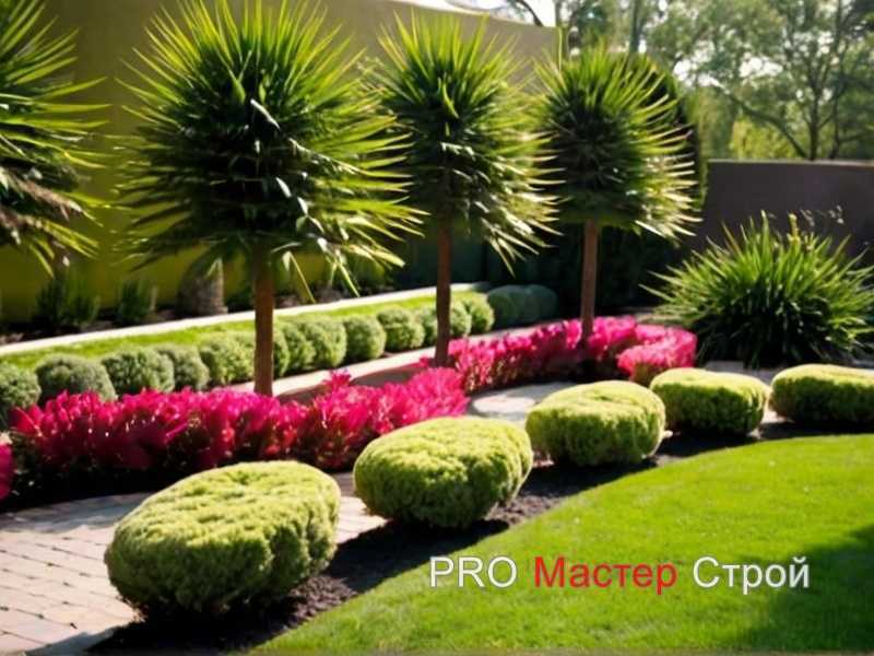 Частота полива зависит от типа растений и погодных условий. Кустарники поливают 2–3 раза в неделю по 5 литров на растение, декоративные травы – 3 раза в неделю по 2–3 литра. Раз в месяц вносят органические удобрения для стимулирования роста и сохранения насыщенного цвета зелени.